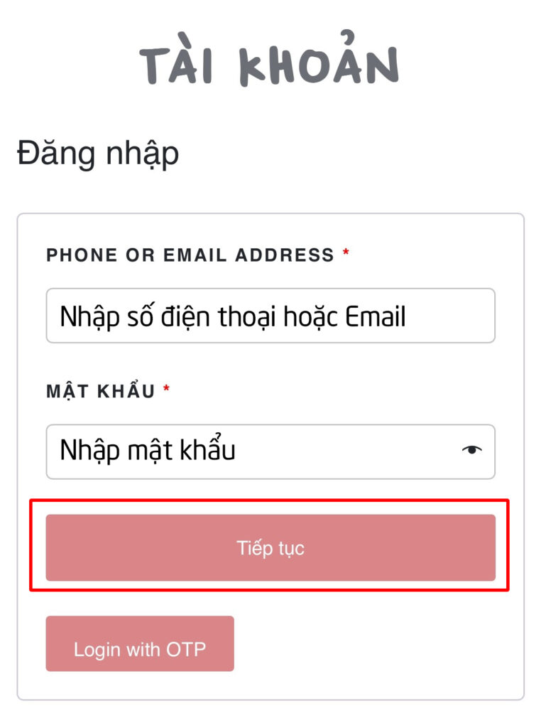 Bước 4: Sau khi điền thông tin hoàn tất Click chuột vào ô “Tiếp tục” để hoàn tất đăng nhập