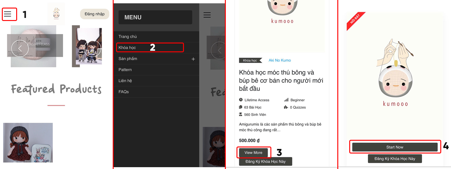 Cuối cùng, sau khi hoàn tất đăng nhập Click vào mục Menu > Khóa học > View more > Start now để xem các bài học